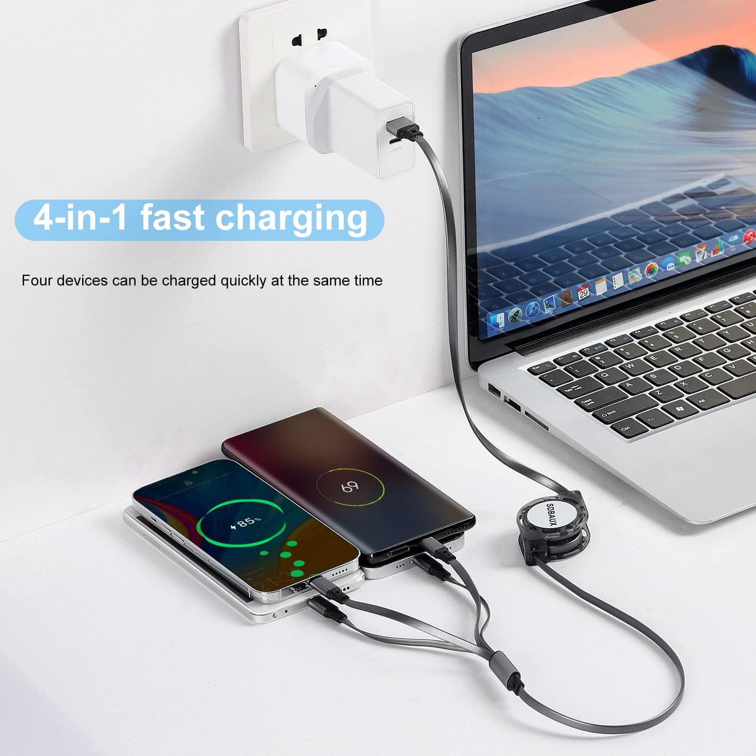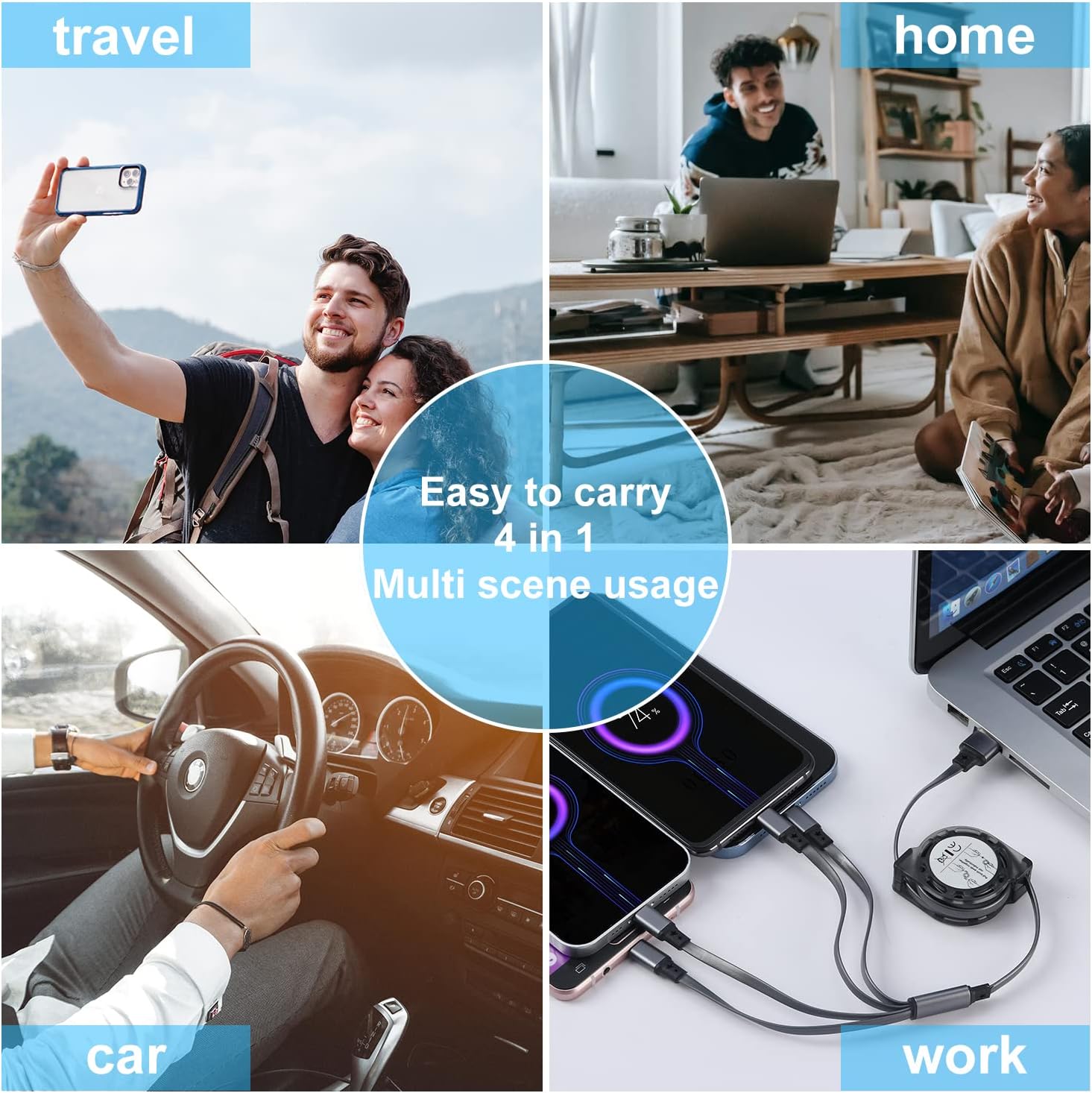 ● 4 The length of the gear is adjustable: the retractable USB 4 in 1 multi-cable has excellent durability and can prevent wear, abrasion and knotting in daily use. You can pull out or retract at will within the range of 0~40/60/80/100 cm, and there will be voice prompts for each gear.