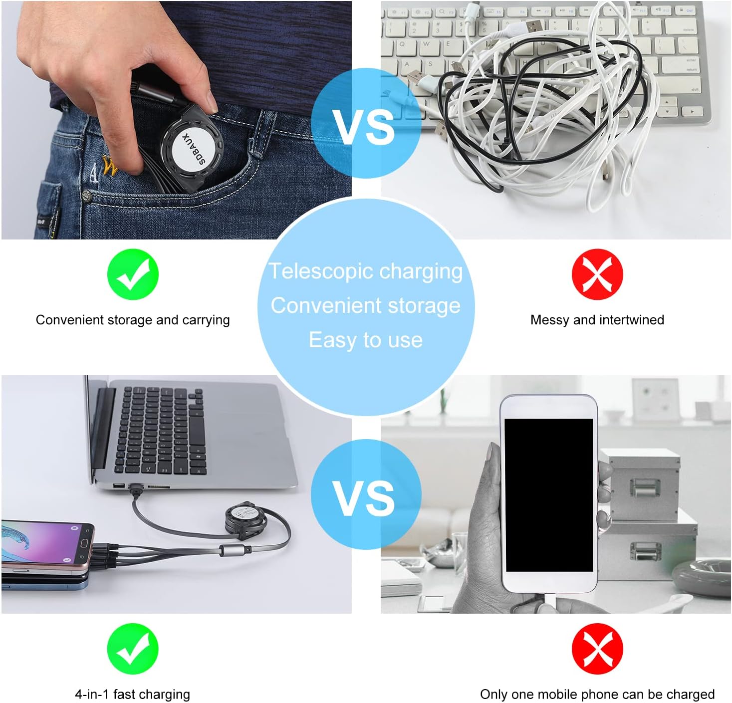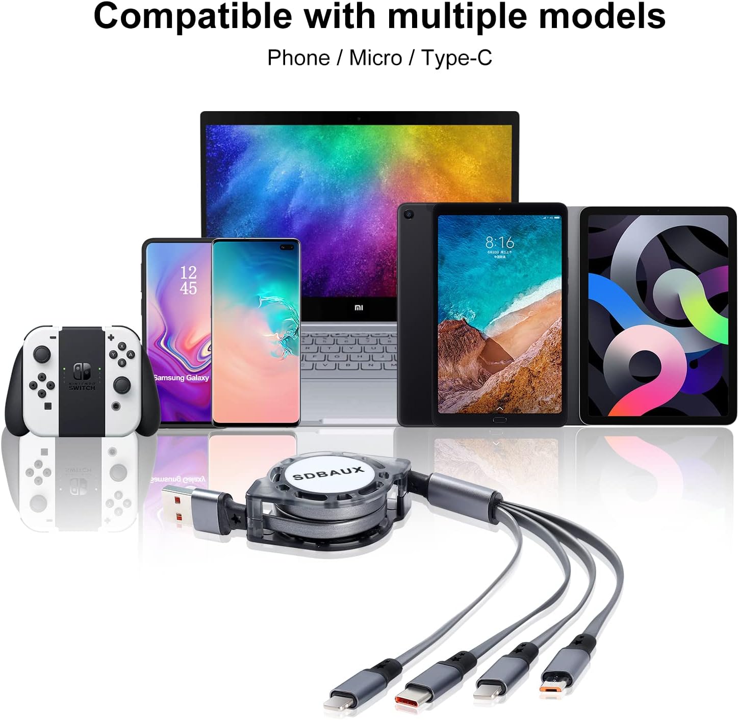 🎁[Retractable Cable Pull Method]: SDBAUX Retractable Charging Cable is a flexible cable. Before using it, you need to read it carefully.When you need to use it, use your two hands to pull both ends of the cable to the outside at the same time and stop at the length(4 grades)you need. After use, the same method, two hands gently pulling will automatically return to its original position and it will store neatly in. Note: You can not just pull from one side of the cable,it will damage it.