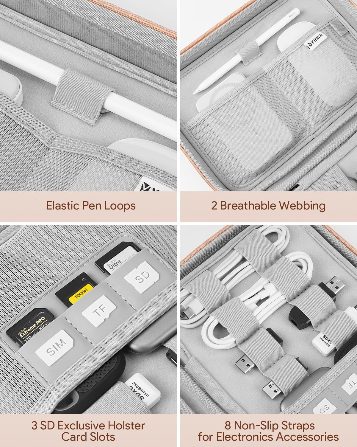 [NEAT AND TIDY STORAGE]: 6 data cable storage rings with Velcro are provided to store your wires, cables, and chargers without getting tangled. The middle compartment not only has card slots for three SD cards, but also 8 elastic rings to store USB drives and other accessories.
